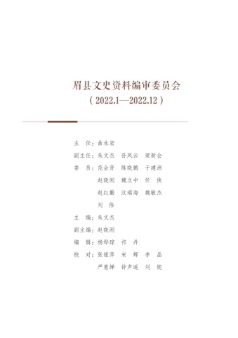 眉县文史资料编审委员会 (2022.1—2022.12) 主 任:曲永宏 副主任:朱文杰 孙凤云 梁新会 委 员:范会贤 陈晓鹏 于建洲 赵晓刚 魏立中 任 侠 赵红勤 汶瑞海 魏敏杰 刘 伟 主 编:朱文杰 副主编:赵晓刚 编 辑:杨烨琼 祁 丹 校 对:张银萍 宋 辉 李 晶 严惠婵 钟声遥 刘 妮