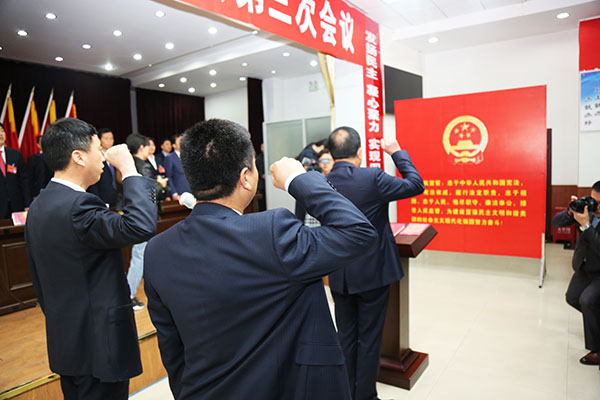 选举结果宣布后,面对庄严的国徽,在与会人员的见证下,三名新当选的同志向宪法庄严宣誓。