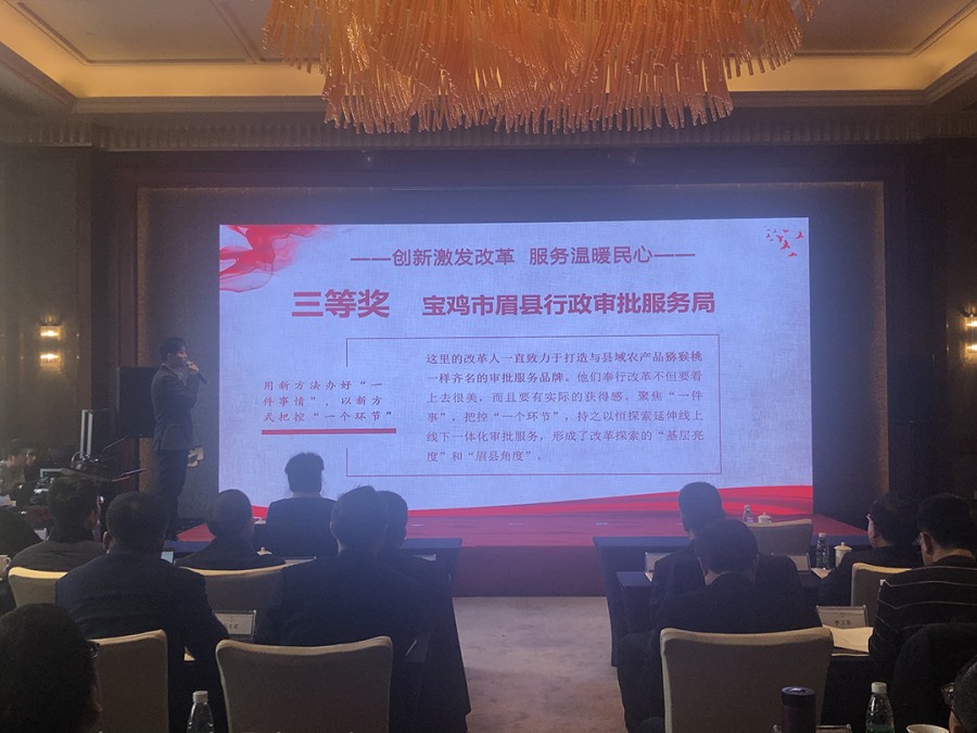 2019年12月30日,陕西省行政审批制度改革工作领导小组办公室在西安举办全省首届十大优秀审批服务案例评选表彰活动,这次评选活动由全省各地市县筛选推荐,共产生入围案例46项,眉县案例作为宝鸡市行政审批服务局初评推荐的3个参评案例之一,入选全省十大优秀审批服务案例并荣获三等奖,在全省县一级是唯一一家。