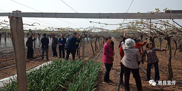 在田家寨村,猕猴桃种植能手朱建彪、李列侠夫妇手把手为贫困群众讲解猕猴桃抹芽技术要点,指导贫困群众做好猕猴桃春季管理。