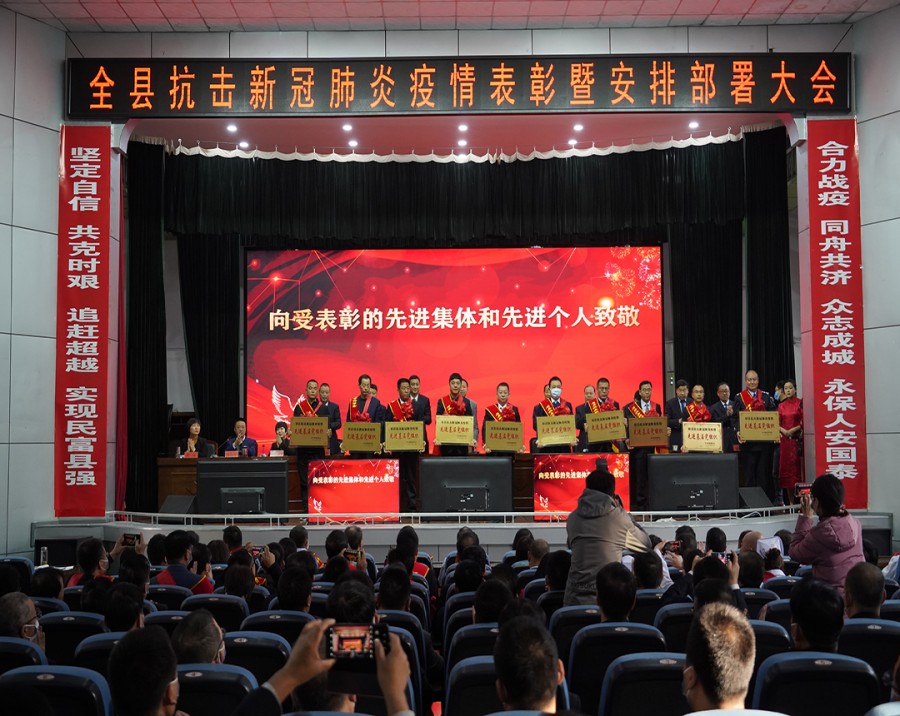 会上,全体人员观看了全县抗击新冠肺炎疫情纪实专题片;副县长李倩对全县疫情防控及卫生健康工作作了总结,并对今冬明春疫情防控工作作了安排;县委常委、组织部部长齐永宏宣读了表彰决定,主席台就坐的县级领导向受表彰的党组织、集体、个人颁发了奖牌证书;5名同志作了表态发言;县委常委、常务副县长戴慧萍宣读了疫情防控倡议书。