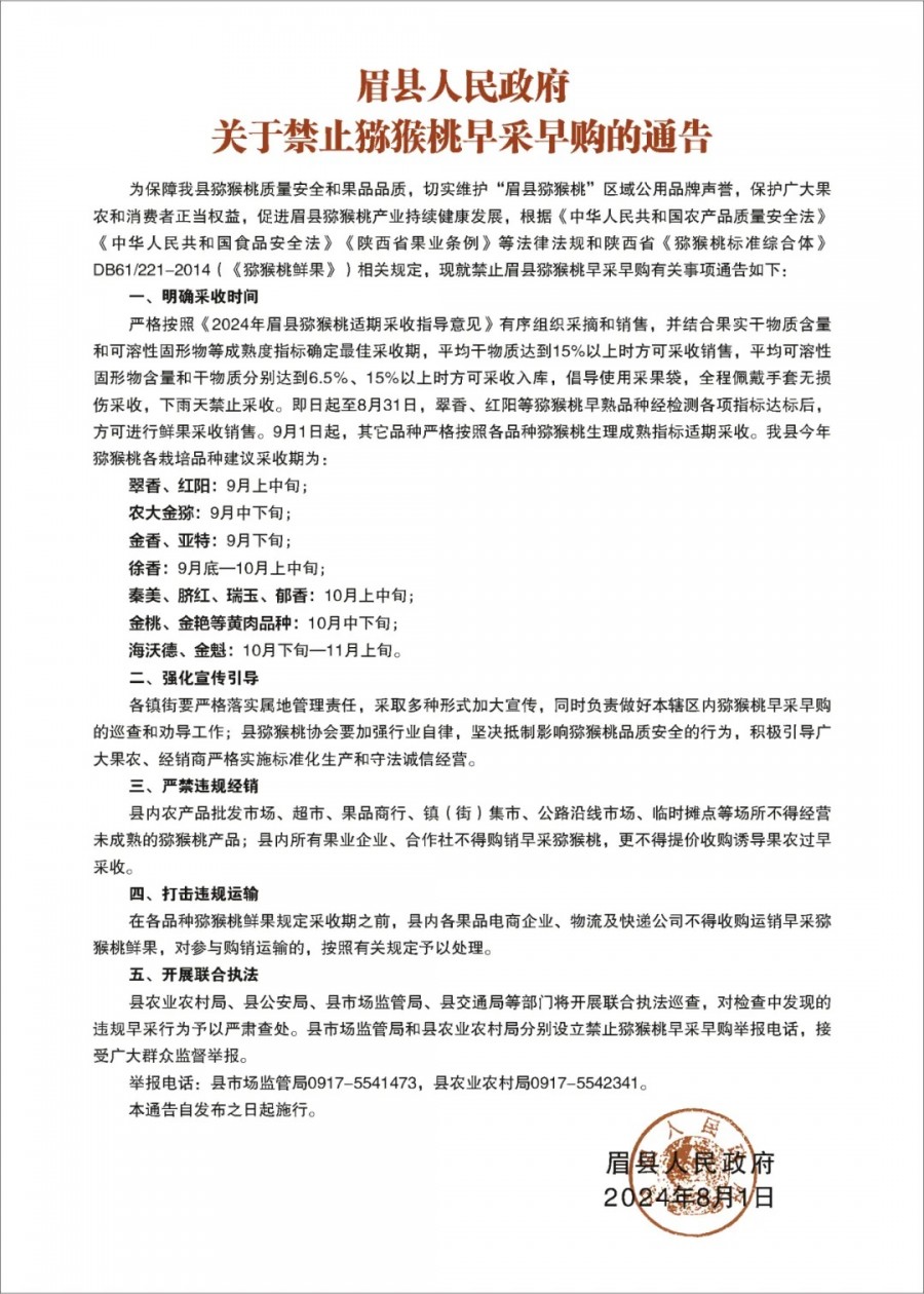 眉县人民政府关于禁止猕猴桃早采早购的通告 |