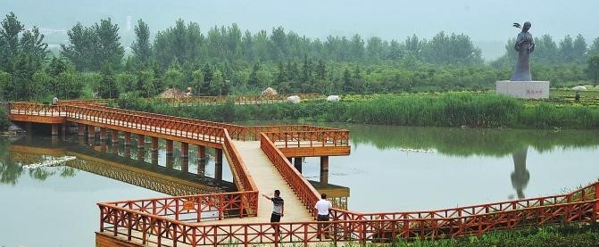 渔夫码头,有几位闲逸的垂钓者,在晨事渔樵,暮弄炊烟的意境里修心养性。古典的廊桥横在湖的南岸,长廊里流转着淡淡的回风,一位红衣的女子,美在缓步之间,纤柔的身姿看变幻的云彩流散,看湖中的波光粼粼,看鱼儿戏嬉,东奔西走。木质的水车在独具风情的秦皇园,吱吱呀呀地转动,仿佛不知疲倦地重复着远古的歌谣,漂浮着岁月的馨香。