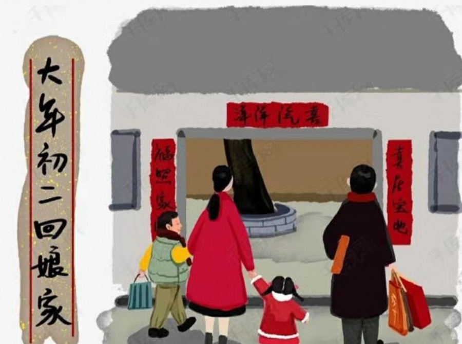 大年初二有一种很有特色的中国岁时风俗——回娘家,这天出嫁的女子无论老少都要回娘家,而且要带上夫婿同行给父母拜年,民间称“姑爷节”、“迎婿日”。这种中国特色的“回娘家”步调惊人地一致,路上的队伍自是浩浩荡荡的。女子回娘家的心情和元春省亲的心情一样,阵势虽然不能与元春相比,但绝对是最强大的,带上夫婿、孩子,还有最隆重的礼品,兴高采烈地老早就出发了。娘家人自然也和贾府一样,全方位地做好了准备,老早站在路口等待着女儿回家。这里最大的看点是刚过门的新媳妇回娘家,农村风俗,第一年回娘家的女子要走的亲戚不仅是自己的亲娘、亲兄弟、亲叔伯,还要走门户,走亲戚的多少也是媳妇娘家门户大小的显示。一般来说第一年走的娘家亲戚少则十一二家,多则二三十家。而且第一年走娘家,礼数自然也是很重的,一般是五色礼,馍、糖、挂面是必须都有的,馍的多少也是彰显礼节的手段,少则十二个馍,多则十六个馍。所以,拉着架子车走亲戚的场景很常见。我们可以想想,路上一波又一波人,穿戴一新,拉着架子车兴高采烈的宏大场景。回到娘家后可能就和元春回到贾府一样,拉扯不完的话题,道不完的牵挂。当然了,这天绝不不会说出“当日既送我到那不得见人的去处”的晦气话的,喜庆是今日的主题,这个一声“姑”,那个一声“女子”把心花都喊开了。吃饭时,东家叫,西家请,忙得小两口不停地给人道歉。