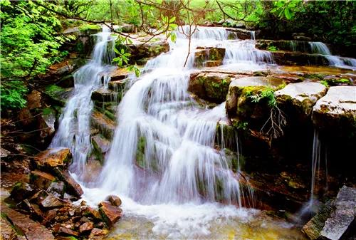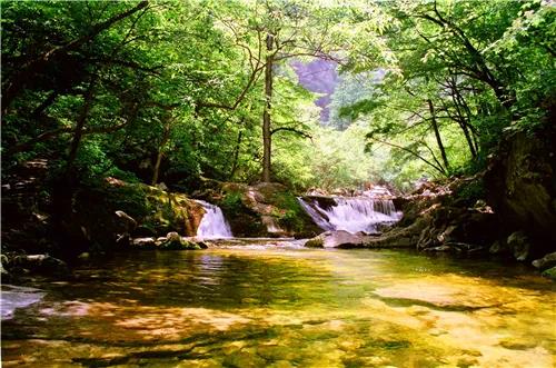 祭拜过太白山神,我们便一路向前。一进山门,一股凉意扑面而来,山门外正值酷暑,山门里凉风习习。随着峰回路转,一座座奇峰千姿百态,树木苍翠欲滴,河水潺潺。在游览了铜墙铁壁、剑劈峰之后,便到了李白醉酒诗百篇的泼墨山、醉卧石,一幅丹青水墨画,一幅李白纵情山水、放浪不羁的石刻,让人浮想联翩。“仰天大笑出门去,我辈岂是蓬蒿人”。李白或醉或醒,或卧或站,或诗或文,洋洋洒洒,活出了一个自然的、真情的人生。再往前走,曲经通幽,沿河边顺势而上,过一山洞,豁然开朗,草房、水池,伟岸的连香树,树荫如盖,仿佛置身世外桃源,不知有汉,无论魏晋。抬头注目,眼前巨石上赫然写着“世外桃源“四个大字,心中暗自叹到:妙!妙!莲花峰瀑布从天而降,飞流直下,水雾弥漫,浪花朵朵,好一处人间胜境。当我们陶醉于世外桃源,不知往返时,却己到了开天关。开天关,听名字就有某种暗示。李白诗云“太白与我语,为我开天关。愿乘泠风去,直出浮云间”。太白山神给诗仙面授了什么机宜,又邀请其上天揽胜,恐怕我们这些常人无法享受如此高的礼遇,也只有一位纵情山水的伟大诗人、诗仙,也才会有如此天人合一的想像!然而,我们追随诗仙的脚步也跨上了仙境。汽车盘旋于陡然升高的山路,眼前一下子开阔了许多,让人恍然进入另一个世界。七女峰,一个像征七仙女婷婷玉立的山峰矗立在前。仙女思凡下界还是倚门迎客,我们都不得而知。