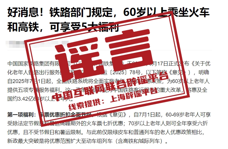 真相:近日,网上有信息称:“中国国家铁路集团有限公司在5月17日曾发布文件,明确自7月1日起,60-69岁老年人可享受除法定节假日和暑运高峰期外的火车票七折优惠;70岁以上老年人则可全年享受六折优惠,且不受节假日和暑运限制。”经核查,上述网络传言不实。国铁集团所有官方信息发布渠道都没有发布所谓《关于优化老年人铁路出行服务的实施意见》的文件。中国铁路12306客服也回应称,中国铁路未发布过上述文件,目前60岁以上老人购票暂无折扣优惠。进一步溯源发现,相关信息大概率为自媒体或营销号利用AI软件生成,其利用老年人的出游意愿以及对车票信息的关注度,使用AI大模型编写虚假信息,依旧是“博眼球,拉流量,变现谋利”的套路。(来源:“上海网络辟谣”微信公众号)