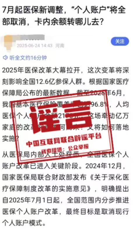 详情:近日,一篇题为《7月起医保新调整,“个人账户”将全部取消,卡内余额转哪里去?》的自媒体文章引起较多关注。文中宣称“从医保局内部人士处获悉,全国医保个人账户改革已进入关键阶段”“自2025年7月1日起,全国范围内分步推进医保个人账户改革,最终目标是取消现行个人账户模式”。