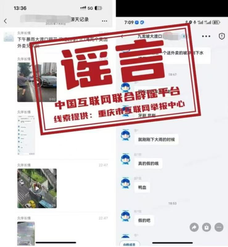 真相:7月8日,有网民在聊天群发布信息称重庆市大渡口区“钢花路刚刚一个送外卖的被冲到下水道里淹死了”,引发关注。经核实,网传信息系谣言。经向相关部门核实,实为7月8日下午,外卖小哥赖某某因下暴雨骑电瓶车撞到施工围挡后摔倒。摔倒后,赖某某因身体无大碍已自行离开。目前,警方已对造谣者展开调查。(来源:“重庆辟谣”微信公众号)