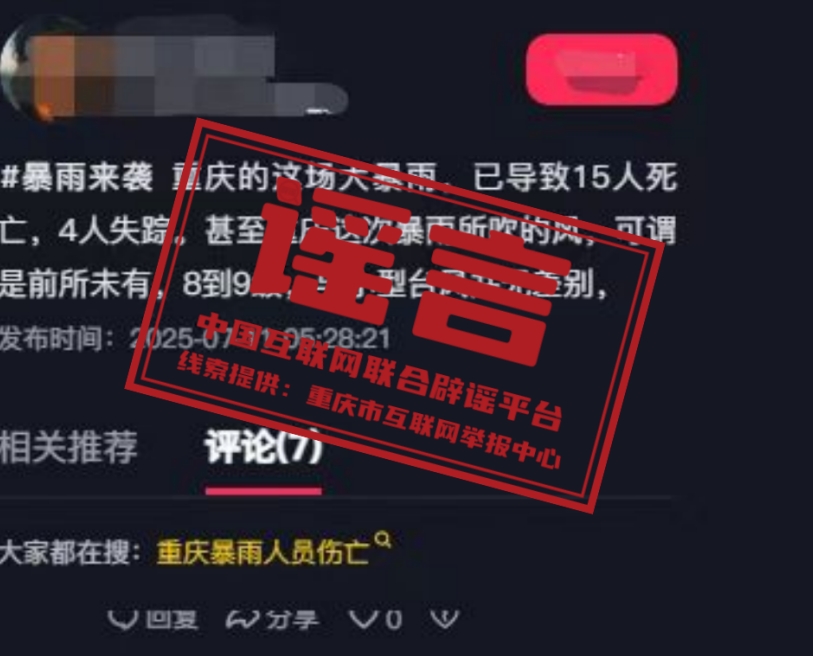 真相:近日,有网民在网络平台发布“重庆大暴雨导致15人死亡,4人失踪”的消息,引发关注。经核查,上述信息系谣言。网民邓某为博取眼球,编造、发布上述虚假信息,引发网民议论,造成不良影响。目前,重庆市酉阳县公安局已依法对邓某予以行政处罚。(来源:“重庆辟谣”微信公众号)