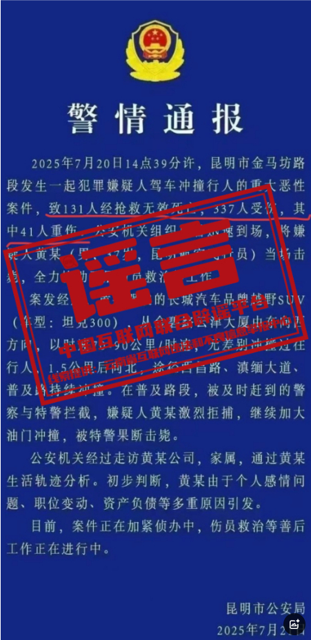 详情:近日,一则内容为“昆明市金马坊路段发生一起犯罪嫌疑人驾车冲撞行人的重大恶性案件,致131人经抢救无效死亡,337人受伤,其中41人重伤”的“警情通报”在网上流传,引发社会关注。经核实,该“警情通报”系谣言。真实情况是:7月20日13时16分,云南省昆明市西山区金碧路发生一起道路交通事故。经昆明市公安局查实,李某某(男,49岁,昆明市西山区人)驾驶一辆蓝色小型越野车行驶至金碧路时,撞上正常行驶的电动自行车及行人,随后驾车逃逸途中又与其他车辆及行人发生碰撞。事故共造成2人死亡,4人轻伤,5人轻微伤,受伤人员已送医院救治,无生命危险。目前,公安机关已将李某某抓获,已排除酒驾、毒驾嫌疑。初步查明属交通肇事逃逸,事故正在进一步调查处理中。(来源:“网信云南”微信公众号)