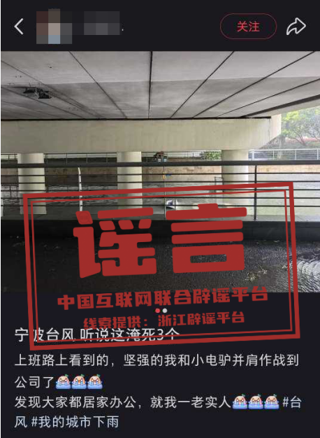 真相:7月30日9时许,某社交平台网民沈某(女,23岁,宁波鄞州人)发帖造谣称“宁波一涵洞内车辆被淹,有3人淹死”。经核查,该内容系谣言,目前公安机关已对沈某依法予以批评教育,该帖文现已删除。