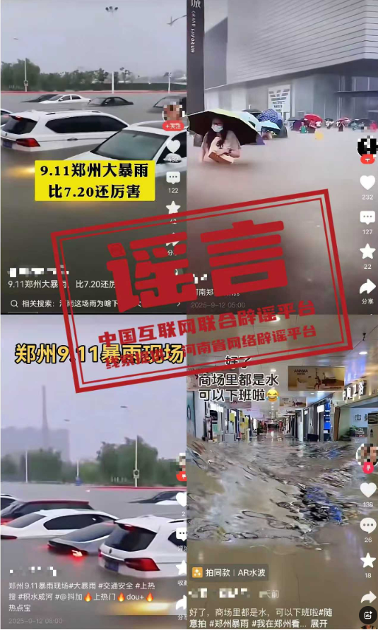 详情:近日,网络平台账号“团团的世界”“在乎在乎的”“雨中悠然听风声”“卫浴喇叭花”“清风”“龙小小”等发布涉郑州汛情雨情信息,经相关部门核实为拼凑剪辑、旧闻翻炒、移花接木、AI技术生成等不实信息,误导网民关注和评论,扰乱网络传播秩序,造成不良社会影响。互联网不是法外之地,在网络上发布信息、发表言论必须遵守法律法规,对自身言行负责,不造谣、不信谣、不传谣。对于编造、传播、散布涉汛情雨情不实信息等行为,网信、公安等部门将依法依规严厉打击,共同维护清朗网络空间。(来源:“清朗河南”微信公众号)