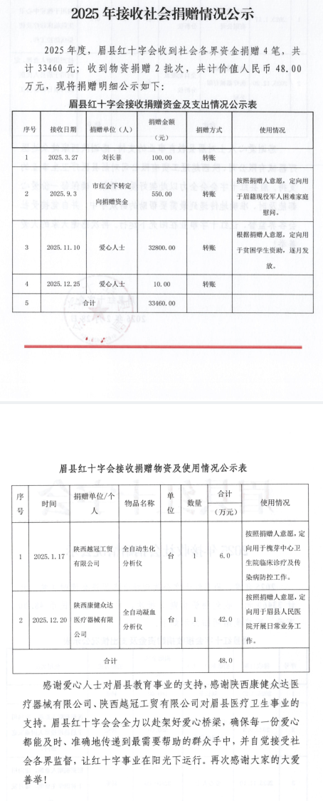 眉县红十字会关于2025年接受社会捐赠情况公示