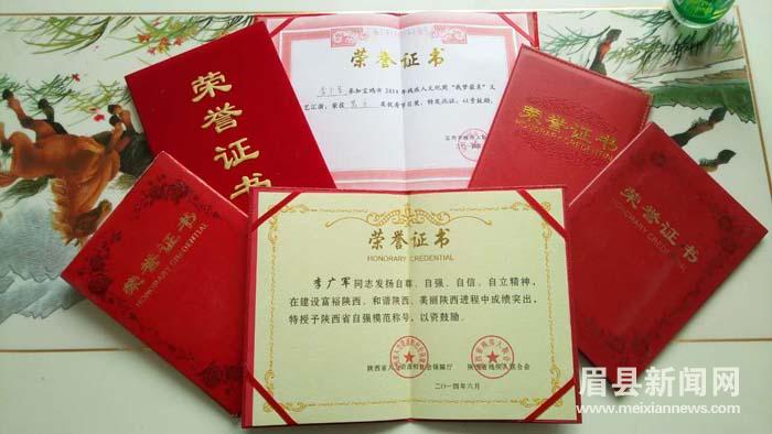几年来,李广军先后投资600多万元安排和带动了眉县260名残疾人就业和自主创业。他本人先后被评为“宝鸡市残疾人自强模范”、“宝鸡市残疾人创业之星”、宝鸡市残疾人自主创业标兵”和“宝鸡市十佳残疾人自强模范”等光荣称号。