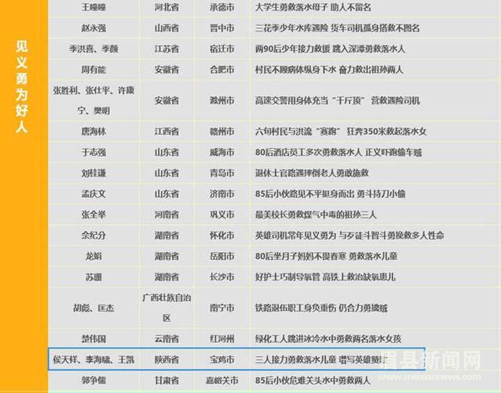 5月 31日,中央文明办发布 5月“中国好人榜”。宝鸡市勇救两名落水儿童的侯天祥、李海啸、王凯英雄群体光荣上榜,被评为见义勇为“中国好人”。