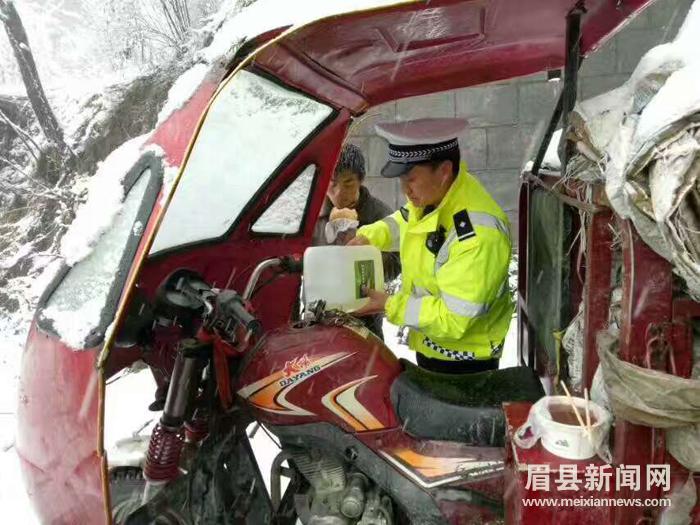 刚才的画面发生在3月13日上午9点左右,眉县交警大队城西中队民警王铁虎和同事李政,李文涛在雨雪天气执勤时,在斜峪关温家山隧道内发现了一名收废品的群众,由于当时雨雪较大,而此时他的三轮摩托车燃油耗尽,这名群众不得不躲在隧道里长达三个多小时,再加上身穿单薄,此时的他已经是又冷又饿又冻,在隧道一旁的路沿上直发抖。三名民警看到后第一时间把三轮车推到安全地带,然后跑到附近的餐馆买来了吃的,正当他吃饭的时候,民警又前往加油站买来汽油,帮他给三轮摩托车加满。看着这名群众安全的离开,王铁虎和他的同事们又回到风雪中,继续执勤巡查。
