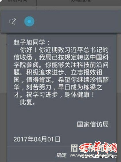 起初,赵子旭致信这件事只有学校科技社团、校团委的几位老师知晓,他表达了自己的想法后,就投入紧张的高三复习备考当中,“没想到,4月1日他接到了国家信访局的短信回复。