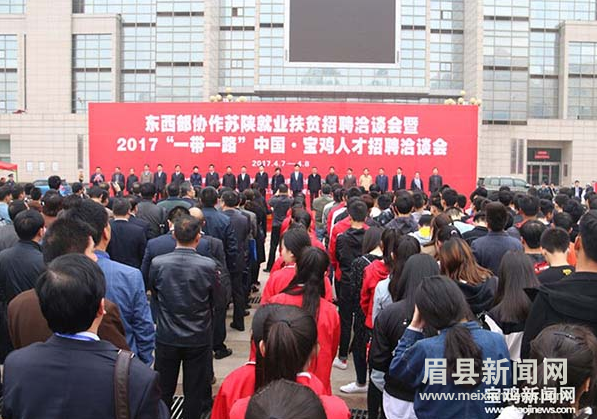 4月7日,东西部协作苏陕就业扶贫招聘洽谈会暨2017“一带一路”中国•宝鸡人才招聘洽谈会在我市举办。来自全国的1000余家用人单位提供了近5万个工作岗位,助力我市转移就业脱贫及高校毕业生就业工作。市委书记钱引安出席启动仪式并致辞。