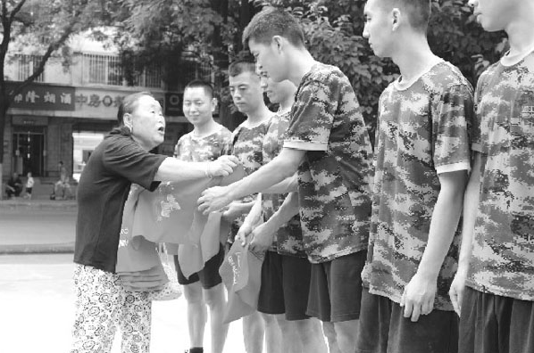当天早上7时许,童秀英背着蛇皮袋走进了广元路消防中队,她一见到消防官兵,就从蛇皮袋里掏出鞋垫往对方手里塞。“老人早上6时20分就坐班车往市区赶了,都没顾得上吃饭。”中队指导员谭佳松告诉记者,因为提前得知老人要来送鞋垫,所以他们在中队候着,没想到老人来得这么早,还给每个消防官兵送了亲手做的鞋垫和手绢。随后,老人又带着40双鞋垫、几双布鞋和手绢等赶到了新华路消防中队,送到了消防官兵手上。