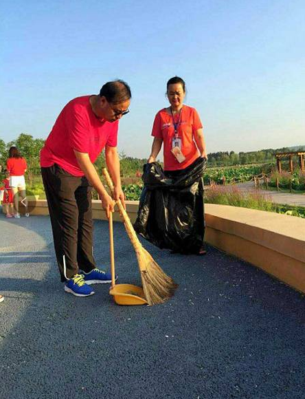 然而随着大量游客的涌入,这里的卫生也成了人们关注的焦点。乱扔生活垃极的现象时有发生,荷塘现配有的清洁工也是疲于应付。为此,“天龙地产”员工在董事长鲁占怀先生的带领下开始了另类晨练,用切身行动保护环境,爱护环境,从“我”做起,增强文明卫生意识,文明旅游、文明健身锻炼,尊重清洁工人的劳动。