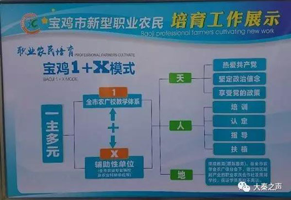宝鸡市农业广播电视学校校长郗银全表示,近几年农村青年人大多都去了城市,农村都是“三留守”人员,青壮劳动力流失使得农村大片土地仅仅种些小麦玉米,种粮入不敷出。2012年开始宝鸡市先后培育初级、中级、高级“职业农民”近5000名。一大批“有文化、懂技术、会经营”的职业农民再言传身教“做给身边农民看、带着身边农民干、帮助身边农民赚”。