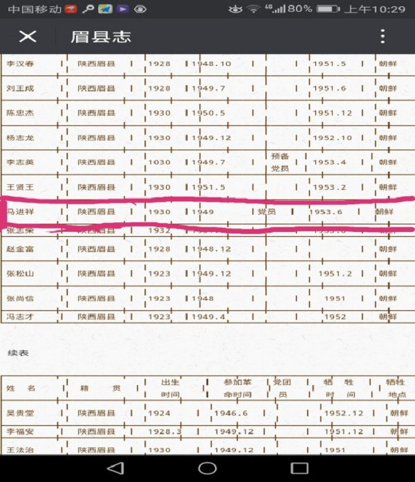 眉县刚解放那会获取信息的路径很少,不要说广播,连报纸都没有,依赖最多的还是靠信件。一封信件是出门在外的人与家最紧密最直接的联系。可部队有规定不让战士日常信件往来,除非是战士遇到了大事情,比如伤残、比如死亡(每次上战场前都会写好遗书放在部队,如果阵亡就由部队将信件寄回烈士家里)。自从知道伯父上了朝鲜战场后,奶奶和全家人都在等,等着伯父寄回信件,等着伯父战胜归来。可是除了不断胜利的消息传回古城村外,关于伯父马进祥的个人消息却一无所有,县里武装部也不能明确告知多次询问伯父情况的奶奶。奶奶盼子心切,天天在等、在盼、在哭,以至于眼睛患上了眼膜肿胀症流泪不止疼痛难忍。终于在1953年底,也就是伯父马进祥去到朝鲜后的第二年,县里来人带来了伯父在抗美援朝第二个阶段(1951年6月11日~1953年7月27日)之1953年6月夏季反击战中牺牲的消息,同时带来的还有一枚“抗美援朝纪念章”和一块“光荣烈属”的牌匾。那时,全家人才知道伯父在即将结束的抗美援朝战争的最后一战、在胜利的黎明前夜牺牲了。父亲对我讲过,当时坚强的奶奶没有当着县里领导的面哭泣,而当她独自一人时,却总是坐在门前的石头上一句话不说面朝东北方向,呆呆的能坐上一整天,而面庞早已泪流成河……..。在我记忆中,奶奶只有一次当着孙辈们的面,对着从朝鲜带回来的伯父“英雄照片”,看了又看摸了又摸,嘴里喃喃低语“到底在啥地方?咋连个骨灰也没有?”听我父亲说,当时牺牲的志愿军太多,大多因战火而烧的面目全非,伯父的遗体无法确认,是和其他人一块合葬的,墓碑及名字也是和其他牺牲的战友写在一起的,而且在异国他乡,当时家人是不被允许前往朝鲜探望的。也许伯父被烈火烧死了,也许被飞机投下的炸弹炸死了,也许抱着敌人滚下了山崖,也许用身体堵在敌人疯狂的枪眼上…...。他一定在牺牲的前一天晚上还在想着他的老娘、他未过门的媳妇、他的大弟、他的大妹二妹二弟们,以及他在古城村的每一位亲人们。他睡在了朝鲜的哪一个地方?他是否面朝西北他的家乡眉县古城村?他是否在上战场前梦见小时候在田里,将他的弟弟当做“假敌人”的“战斗”场面?所有这些,他的亲人们都不得而知,所有这些,他的亲人们只能靠猜想和做梦。伯父,你一定不知道你的弟弟妹妹后来都已结婚成家生子续孙,你一定不知道你的母亲三十年后也故去了,你更不知道,你身患癌症的弟弟马明全在生命垂危的1993年还在念叨着你的名字,我当时没有听清我父亲到底说了些什么?只看见他的手指向挂在门框旁边的那块镌刻着“光荣烈属”的牌匾。我明白了父亲是想告诉我们,他是烈士马进祥的弟弟,我们是烈士马进祥的后代,都是烈士的亲人。
