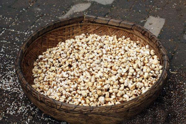 一听到爆米花的来了,我撒腿就往大场里跑,一探究竟是怎么回事?等我到达时,场上已围着好几个人了。有的端着黄澄澄的玉米,腋下夹着一个袋子,也有端着洁白的大米,还带着几粒用纸包着的糖精。人是围了不少,老大爷也准备开工,可等着爆米花的人你看看他,他看看你,没人愿意先爆第一锅米花。我很好奇,为什么不抢爆第一锅呢?老爷爷说第一锅爆米花的,只收一角钱的加工费。村里陆续传来“嘭、嘭”的巨响,是那个黑乎乎鼓着大肚子的铁疙瘩,在一个竹子背篓边爆响的,在高温高压状态下瞬间释放巨大的能量所产生的喷发,将米花溅得到处都是,被围观看热闹的孩子们哄抢拣拾。白白胖胖的米花,的确开得那么洁白灿烂,入口即化,还没品出是什么滋味就吃完了,空气中弥漫着香甜的米花味道沁人肺腑,十分诱人,我蹲在旁边观看着,耐心企盼着下一声的巨响。